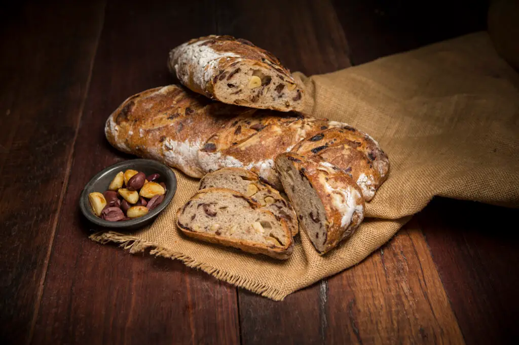 Sourdough rich with whole cloves of roast garlic & olives, for the lover of garlic.